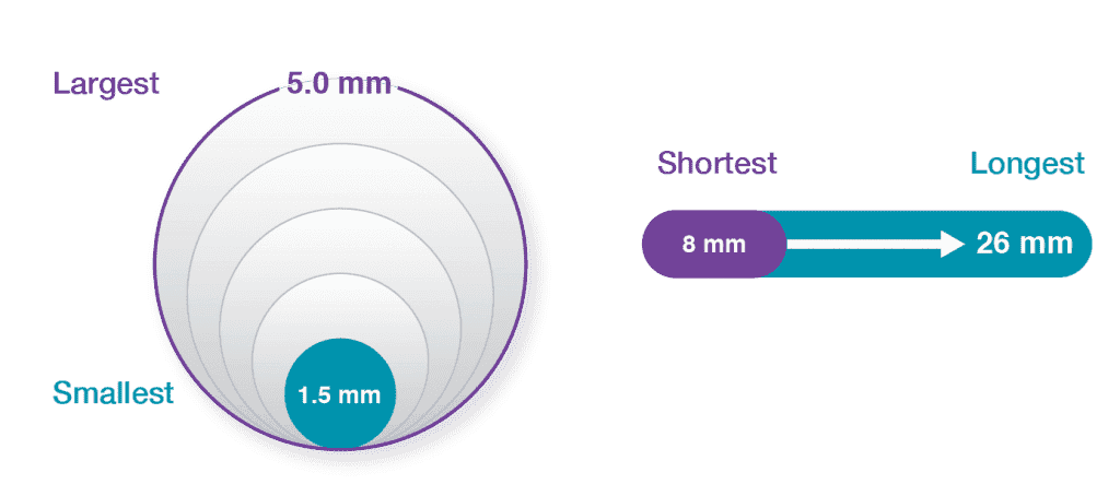 Diameter range from 1.5 to 5.0 mm with lengths up to 26 mm for broadened range of treatment